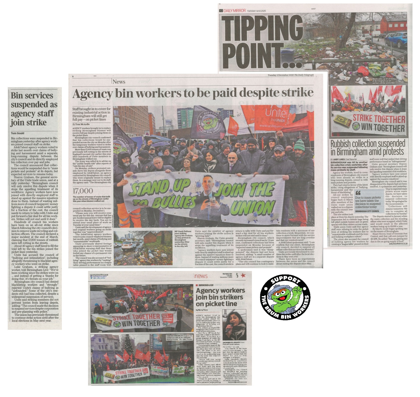 In an unprecedented development, workers directly employed by Birmingham council have now been joined on picket lines by agency workers employed by Job & Talent on the refuse contract. The Job & Talent workers voted in favour of strike action over bullying, harassment and the threat of blacklisting at the council’s refuse department two weeks ago.