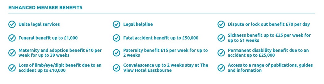 In addition to the core legal and industrial support provided to members, Unite also offers a package of valuable protection benefits which provide important security for you and your family. Unite's benefit package for our Enhanced members is second to none across the whole trade union movement.